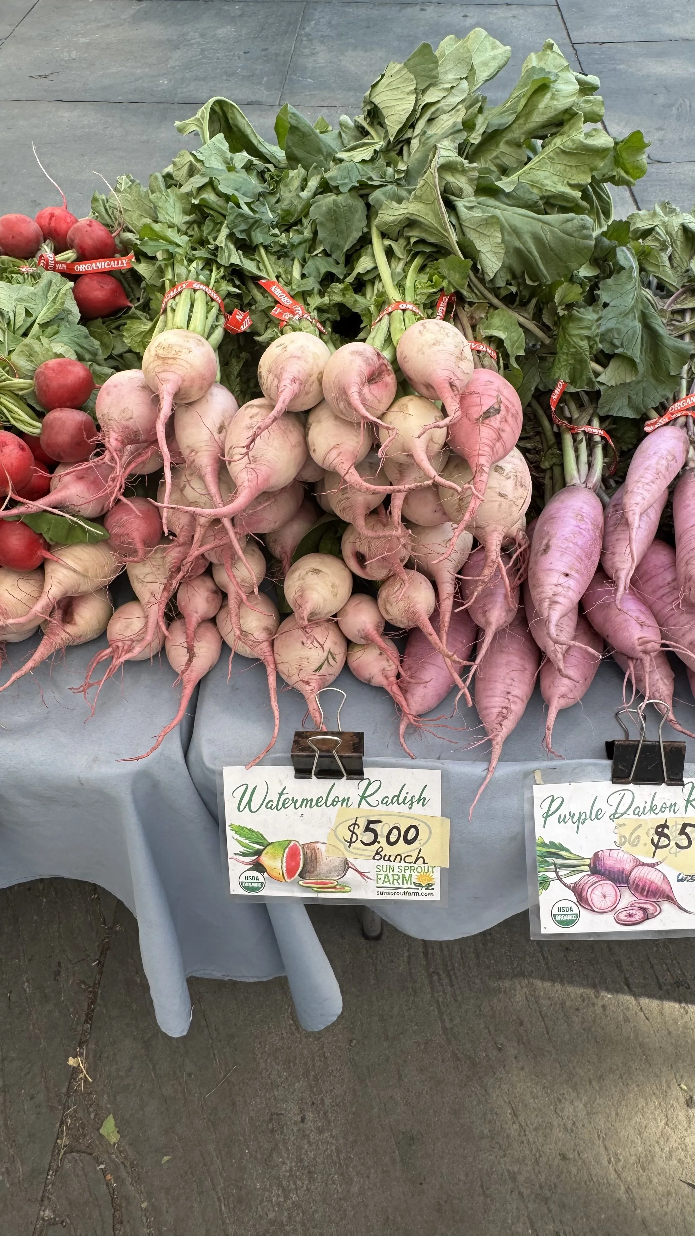 I stumbled upon these gorgeous radishes called watermelon radishes. If you’ve never heard of them, they have a stunning pink interior that’s revealed once you cut them open. They add a pop of color and a subtle peppery bite that can elevate almost any dish a favorite ingredient among many restaurants.