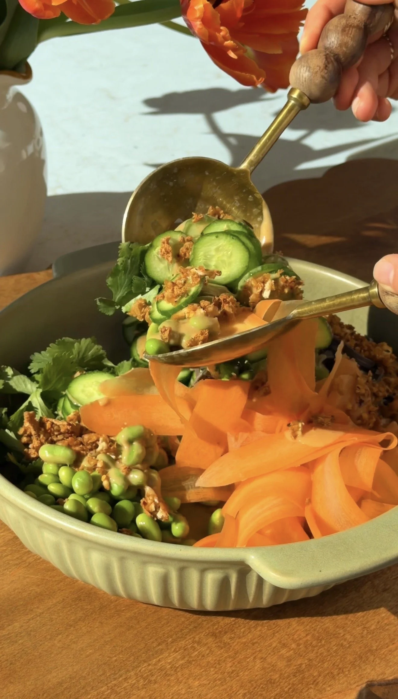 Place the soba noodles in a large bowl. Add carrot ribbons, cucumber, edamame, and loosely packed cilantro. Layer the crispy shredded tofu on top. Drizzle with creamy peanut dressing and squeeze fresh lime juice over the salad. Toss gently to coat everything evenly. I love to squeeze fresh lime after everything is mixed together for some fresh citrus zest.