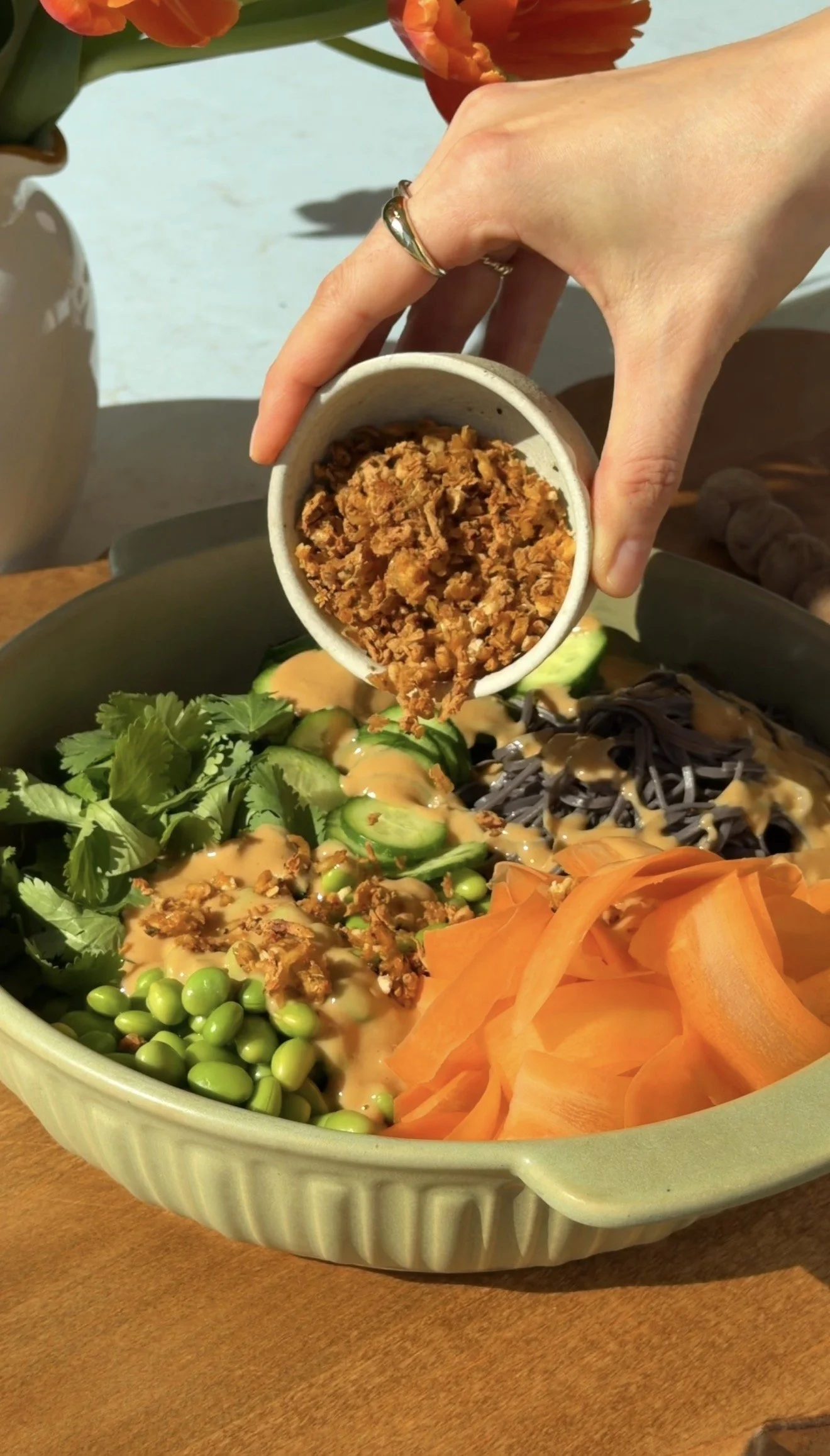 - Add the noodles to a large bowl with carrot ribbons, cucumber, edamame, cilantro, and the crispy tofu. Pour the peanut dressing over the noodles and toss to combine.